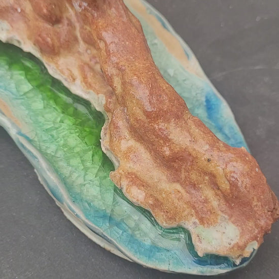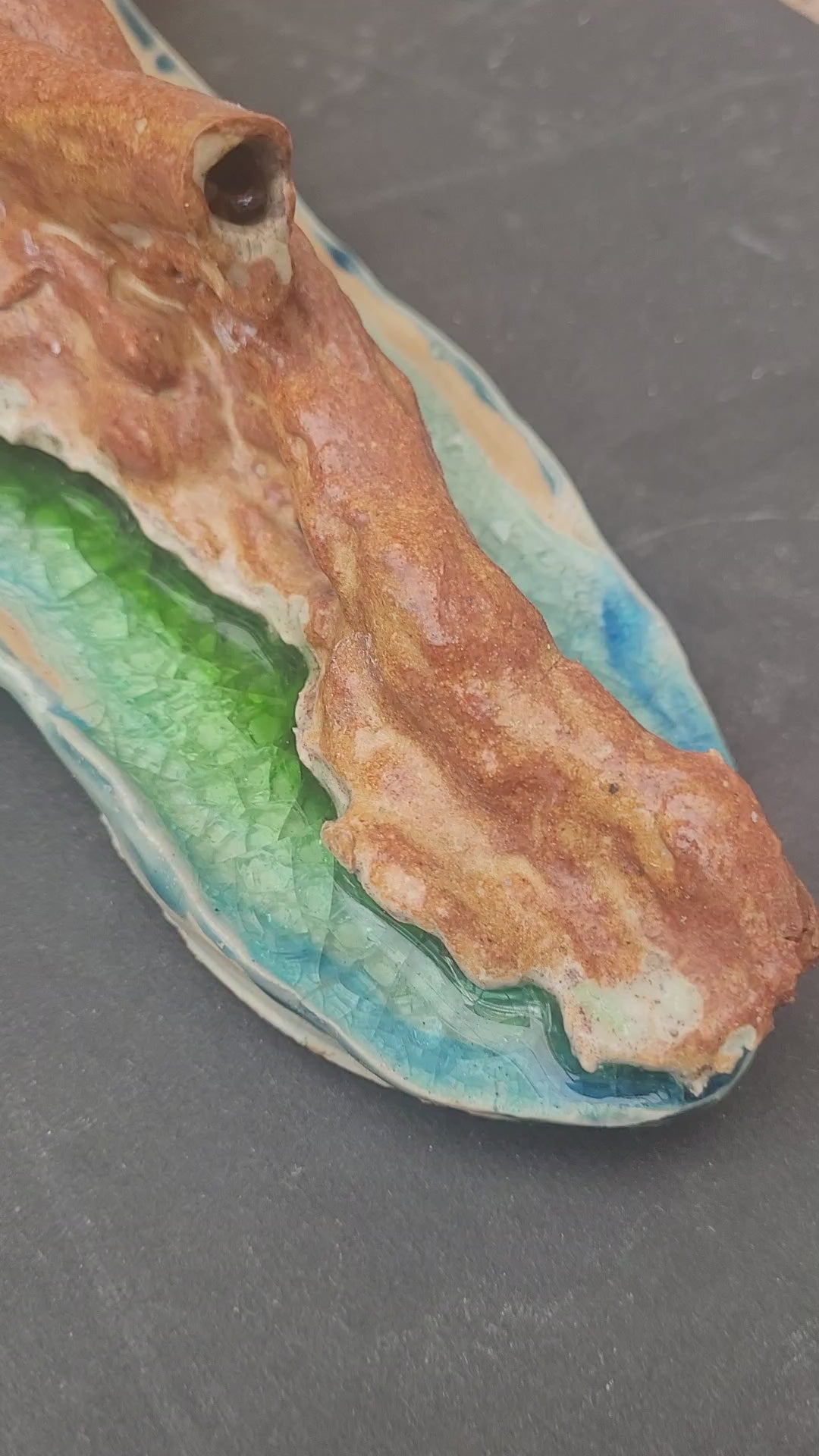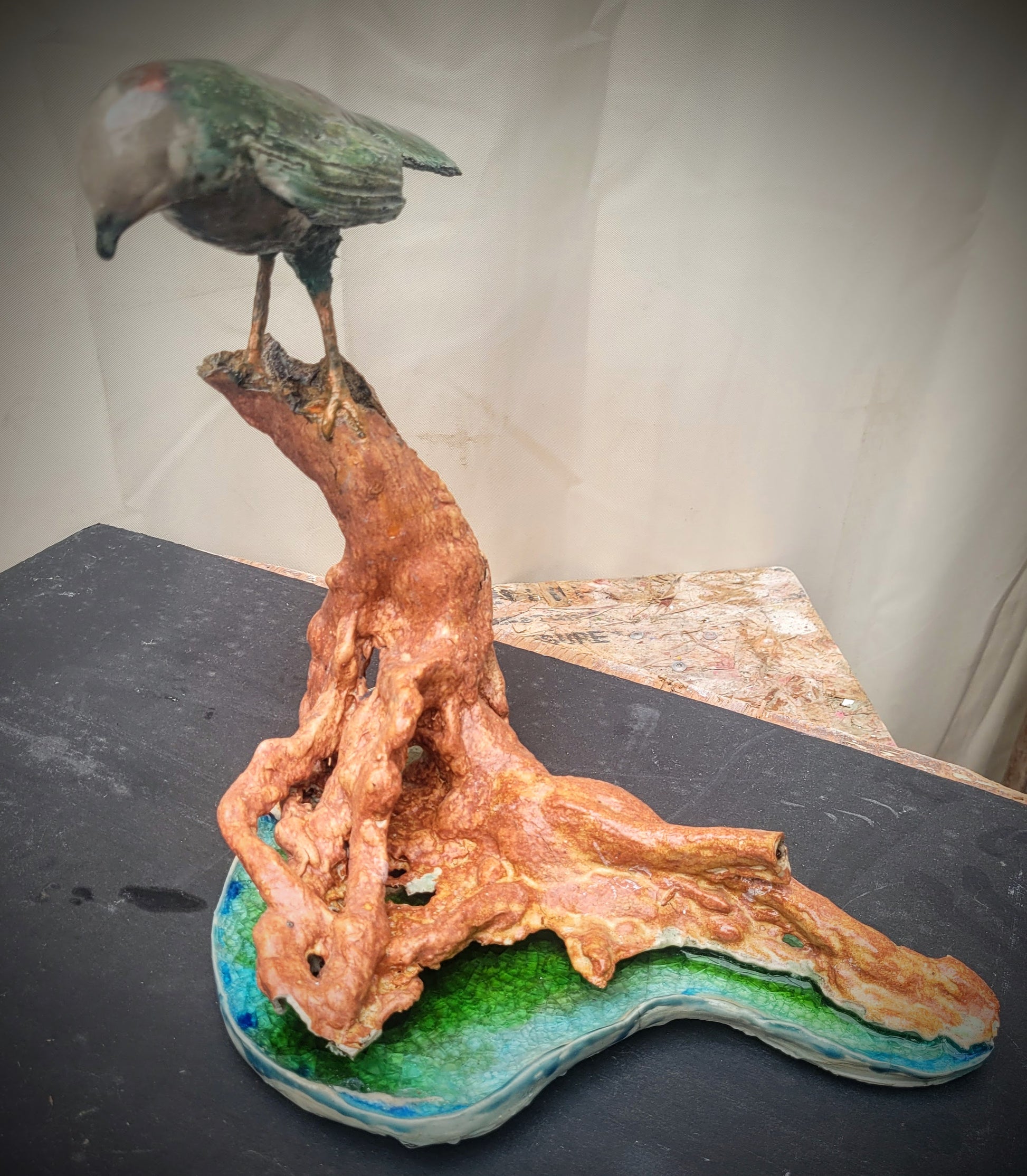 Raku fired ceramic bird perched on a ceramic branch. 22"x12"x14". Suitable for indoor display. Multimedia.